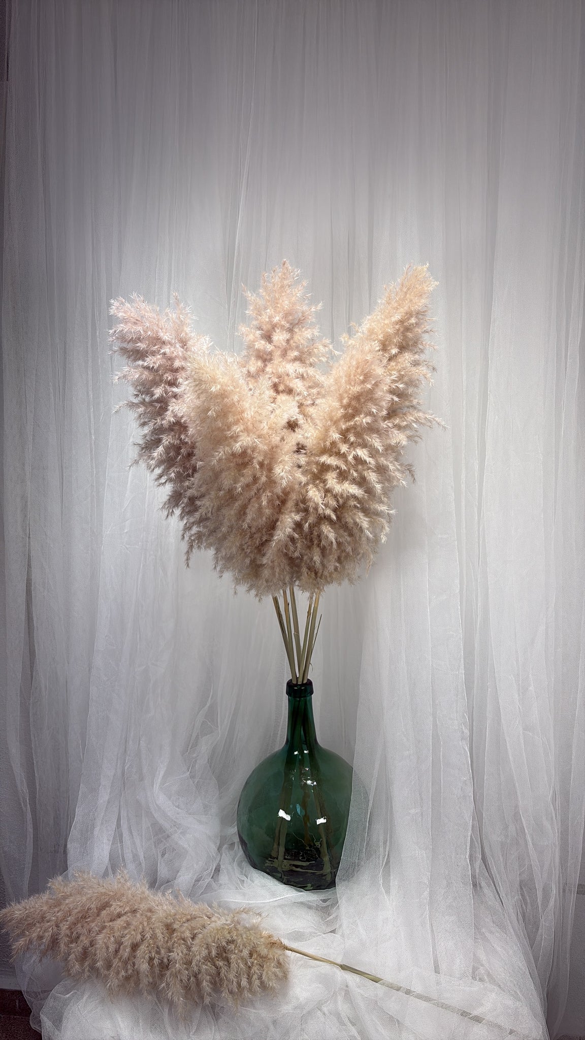 Preciosas Pampas Holandesas de color beige claro. De aspecto muy muy esponjoso, darán un toque muy especial a cualquier rincón de tu casa. Estos plumeros quedan ideales en jarrón de boca estrecha, sobre todo en damajuanas.